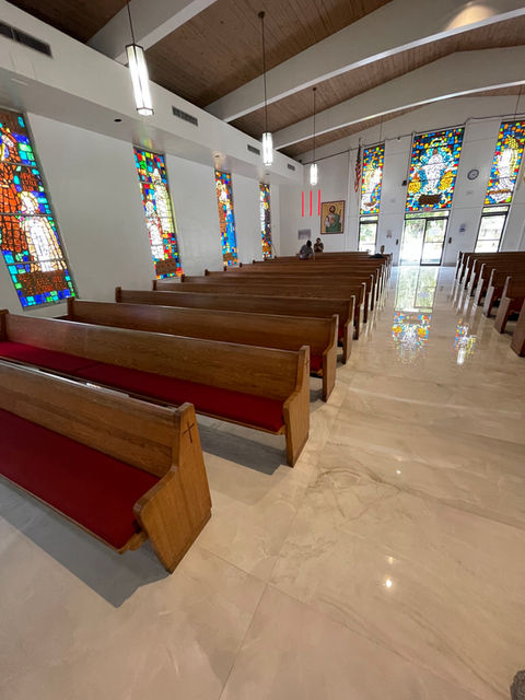 We completed a full renovation on the church, including the installation of support beams under the church (which sits above a gym) in order to build a new marble sanctuary and altar. The built in statue alcoves shows off our custom woodwork, while the stained glass installation displays our glass expertise.